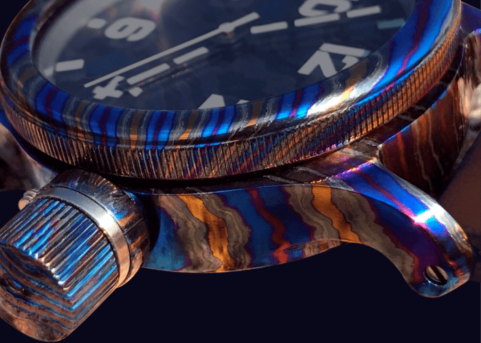 Эти часы созданы из уникального сплава из титана и циркония. Причем обработка производится исключительно вручную, по классической дамасской технологии, когда слои металла накладываются друг на друга, проковываются, скручиваются, нагреваются и вновь многократно проковываются.